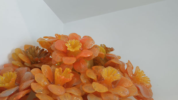 She created a group of fleshy, colourful, glass flowers that project passion, life and strength. The colours of the flowers gradually fade and lose shape, stretch until they are so deformes they can no longer be identified as flowers. They now cannot even be associated with their shape's starting point. They are transparent, naked and emptied.