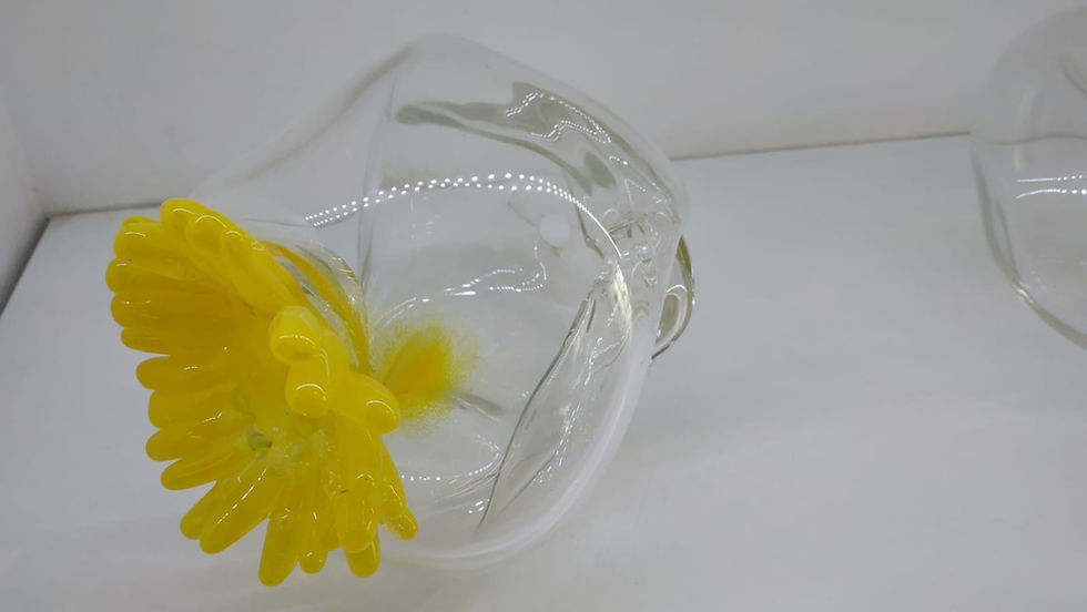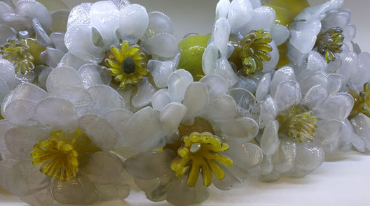Installation composed of 26 glass flowers and 9 clear-yellow glass objects.